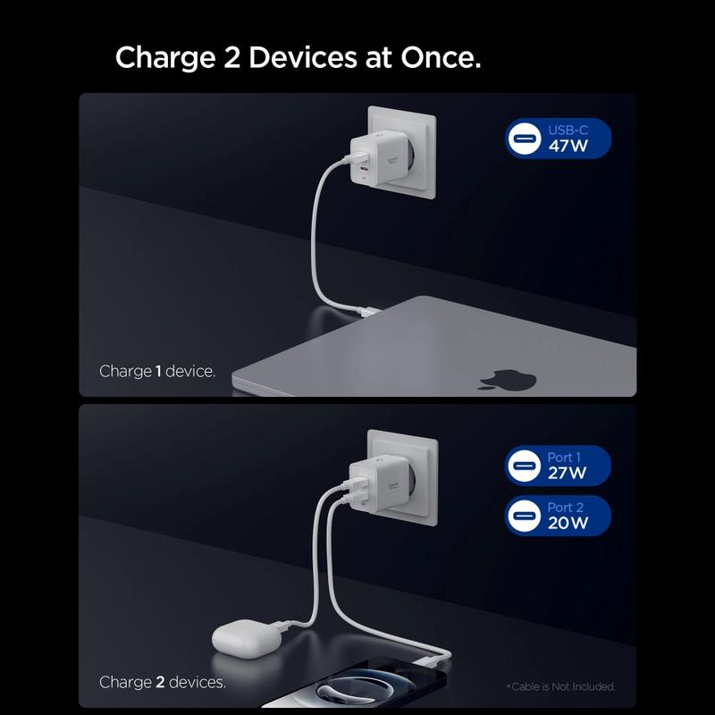 Le Spigen Essential EE472EU est un chargeur mural GaN Pro puissant et compact conçu pour recharger rapidement deux appareils simultanément tout en maintenant une gestion sûre et intelligente de l'alimentation. Doté de deux ports USB-C, il ajuste automatiquement la sortie en fonction du nombre d'appareils connectés : un seul appareil peut tirer la totalité des 47 W de l'USB-C(1), tandis que deux appareils connectés bénéficient d'une sortie partagée efficace de 27 W + 20 W.