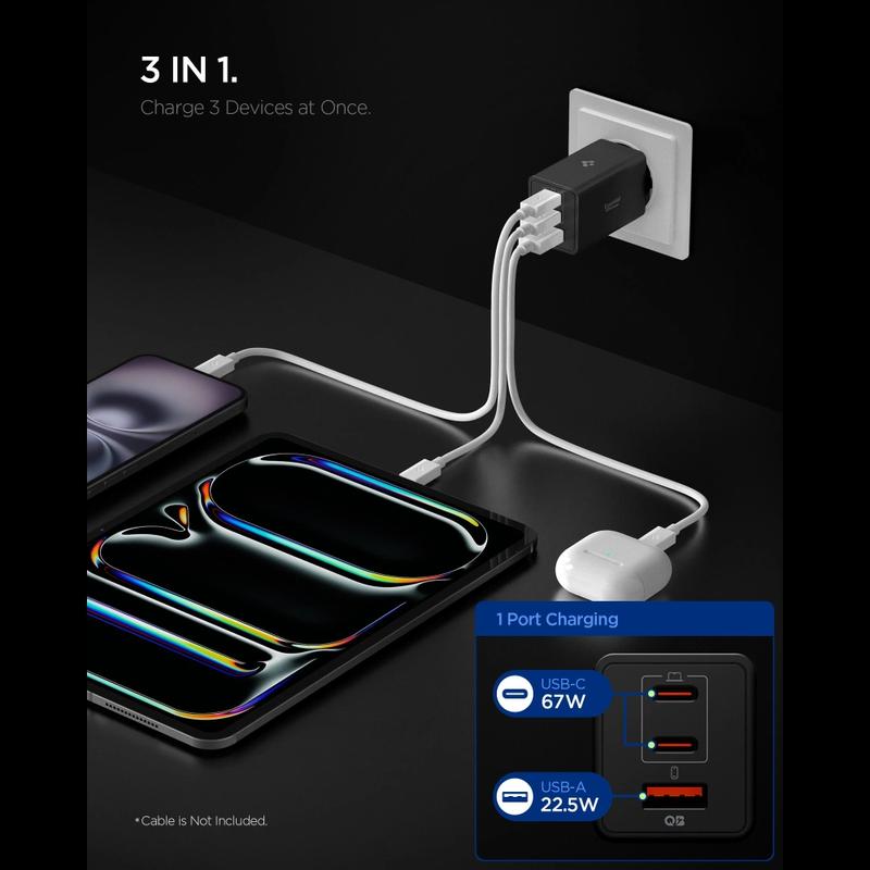 - Chargement rapide à 3 ports avec deux ports USB-C (jusqu'à 67W) et un port USB-A (22,5 W)