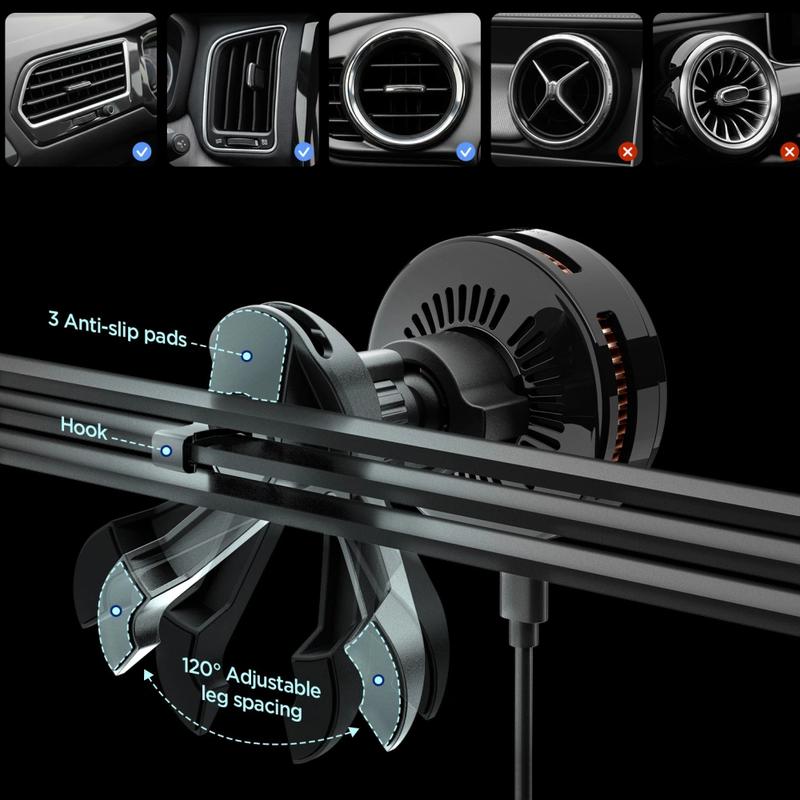 Renforcé par des aimants de qualité N52, le support offre une fixation magnétique exceptionnellement forte, ce qui permet à votre téléphone de rester en sécurité et parfaitement aligné sur les routes accidentées. La tête rotative à 360° vous permet de positionner votre téléphone horizontalement ou verticalement, tandis que le solide clip de ventilation s'adapte à la plupart des véhicules (à l'exception de certains modèles Mercedes-Benz avec des bouches d'aération en saillie).