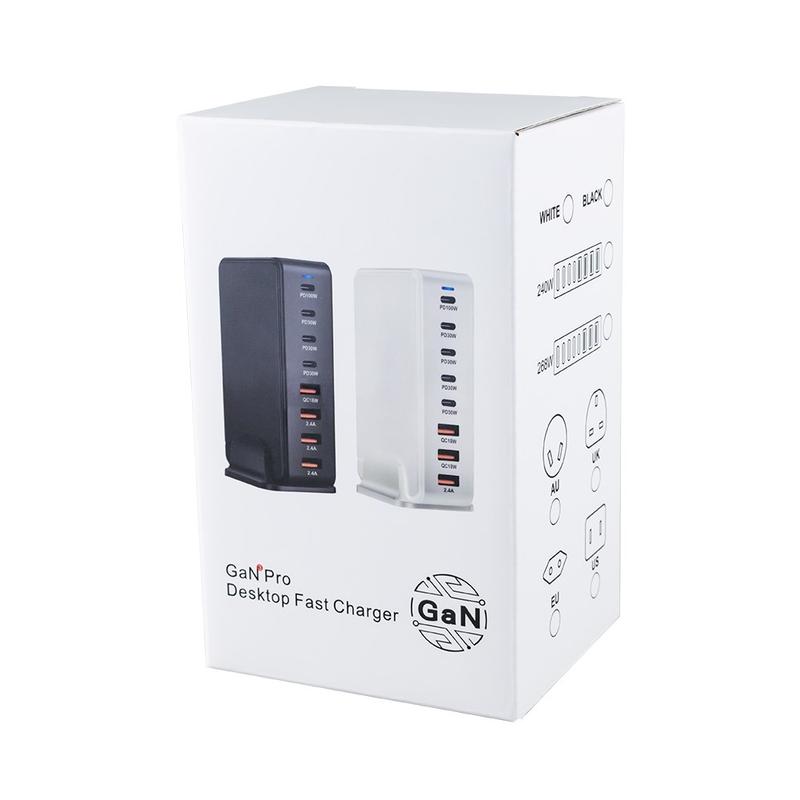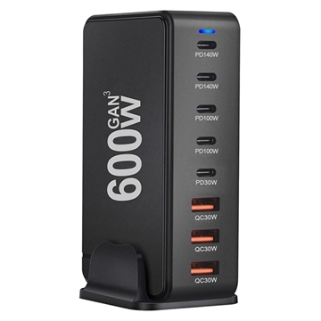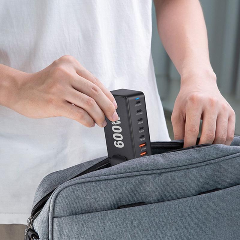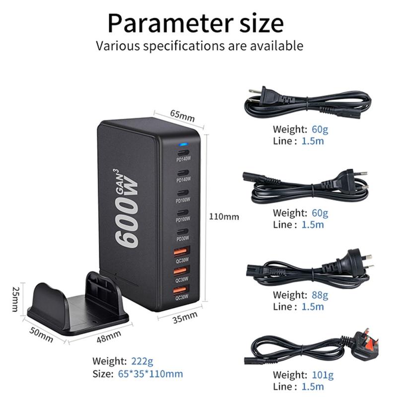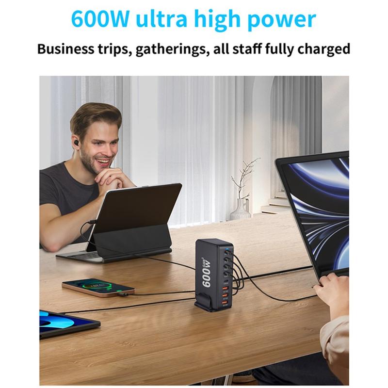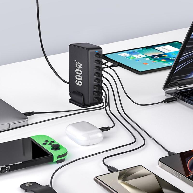 Station de charge de bureau GaN 600W - 8 ports (5x USB-C + 3x USB-A) Chargeur rapide PD3.1, jusqu'à 140W USB-C, distribution d'énergie intelligente