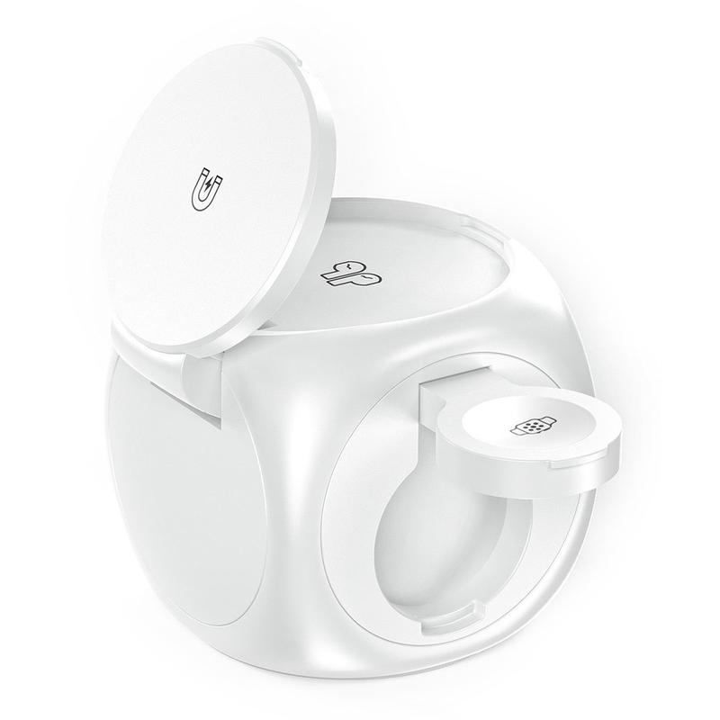 Simplifiez votre configuration de charge avec la station de charge sans fil 3-en-1 Y22, un élégant chargeur magnétique en forme de cube conçu pour alimenter simultanément votre iPhone, votre Apple Watch et vos AirPods. Avec ses performances de charge rapide, son alignement magnétique puissant et sa forme compacte, c'est la solution de charge ultime pour le bureau ou le chevet.