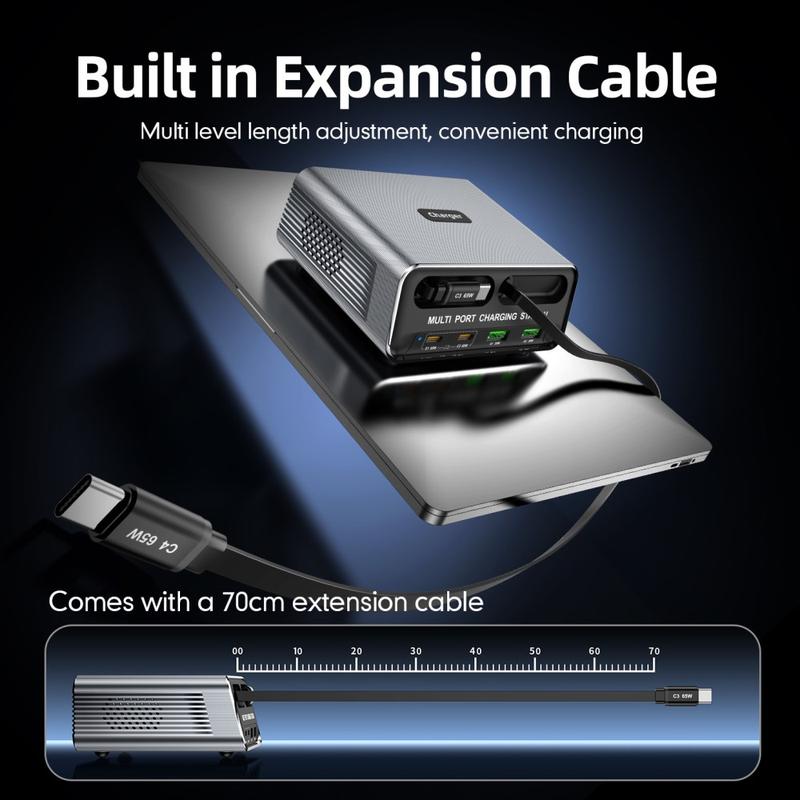 - Conception intégrée à 6 ports : 2xUSB-C + 2xUSB-A + 2x câbles USB-C rétractables