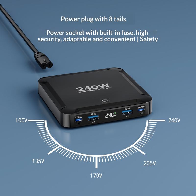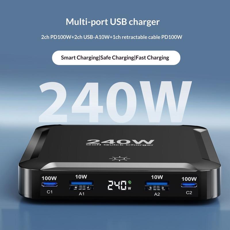 • Station de recharge de bureau BK-124D 240W avec câble USB-C rétractable - Hub de recharge rapide avec 2 ports USB-C et 2 ports USB-A, écran LED et prise européenne