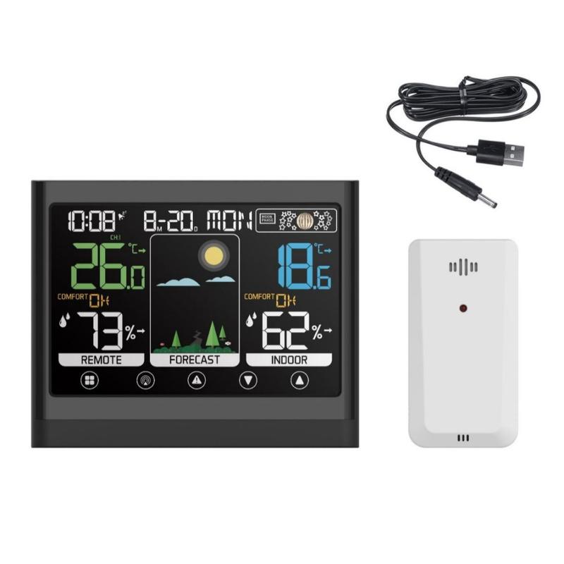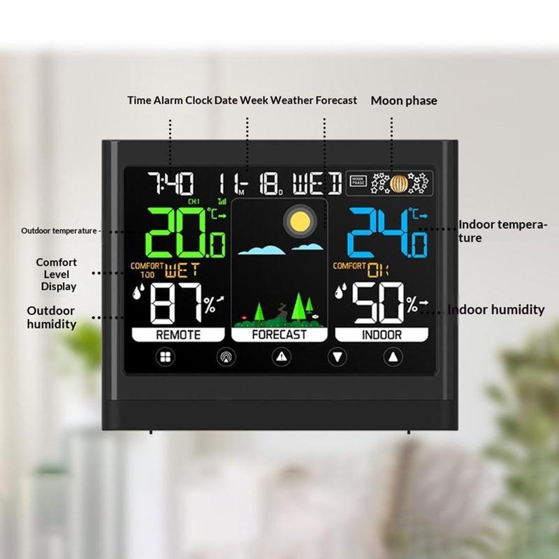 - Horloge météo à écran tactile couleur avec thermomètre, hygromètre, prévisions et alarme