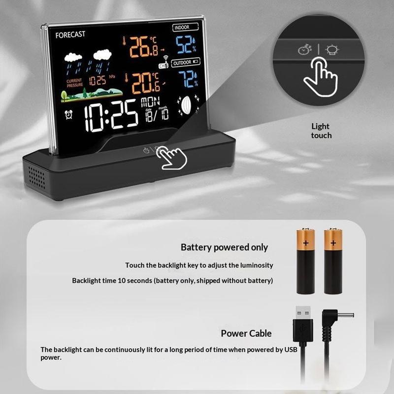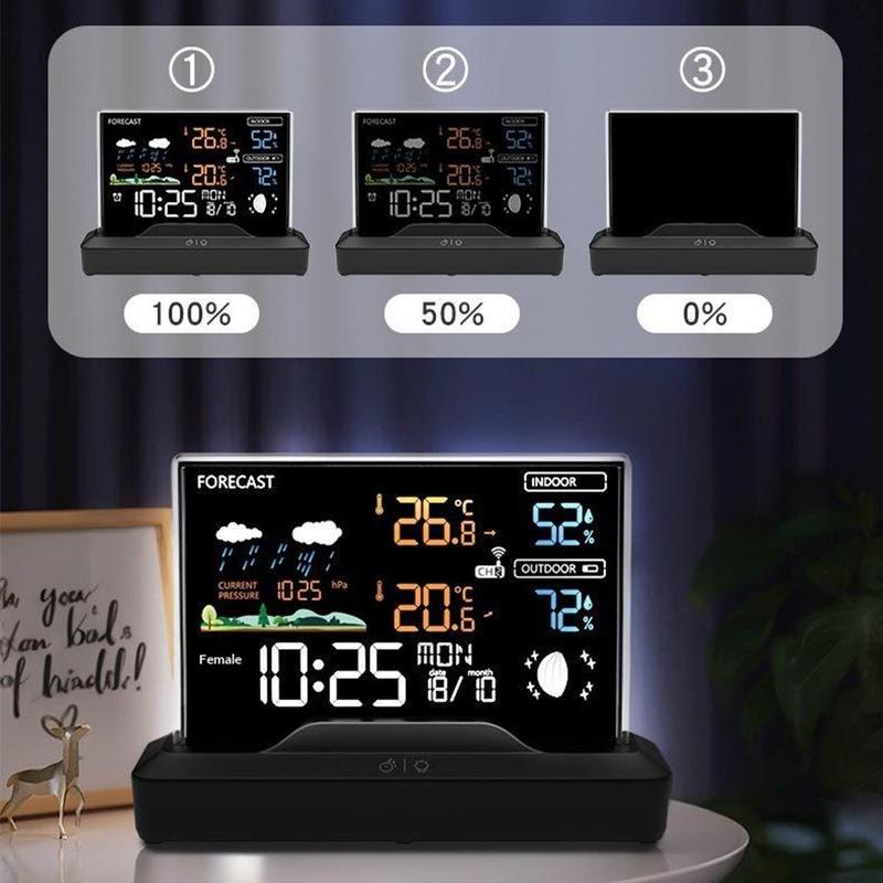 L'écran LCD couleur affiche les informations clés dans un format facile à lire, notamment la température, l'humidité, les prévisions météo, l'heure, la phase lunaire et la pression barométrique. Il est ainsi facile de vérifier plusieurs détails importants à la fois sans avoir besoin d'appareils distincts. Le rétroéclairage améliore la visibilité, tandis que le mode USB offre 3 réglages de luminosité pour que vous puissiez adapter l'affichage à votre pièce et aux conditions d'éclairage.