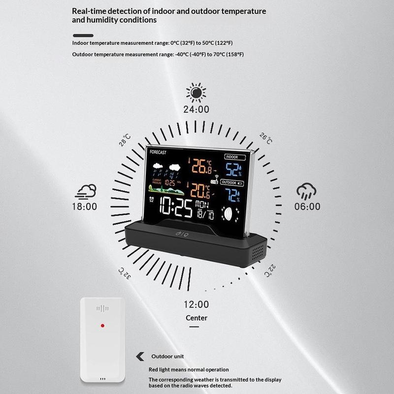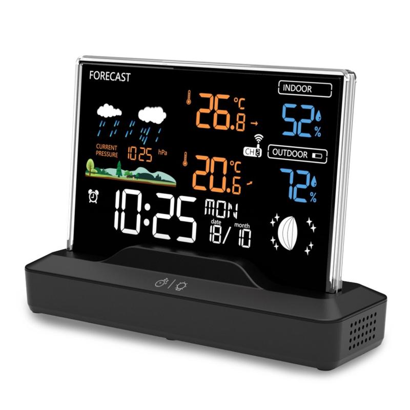 Station météo sans fil avec écran LCD couleur, thermomètre d'intérieur/d'extérieur, hygromètre et réveil