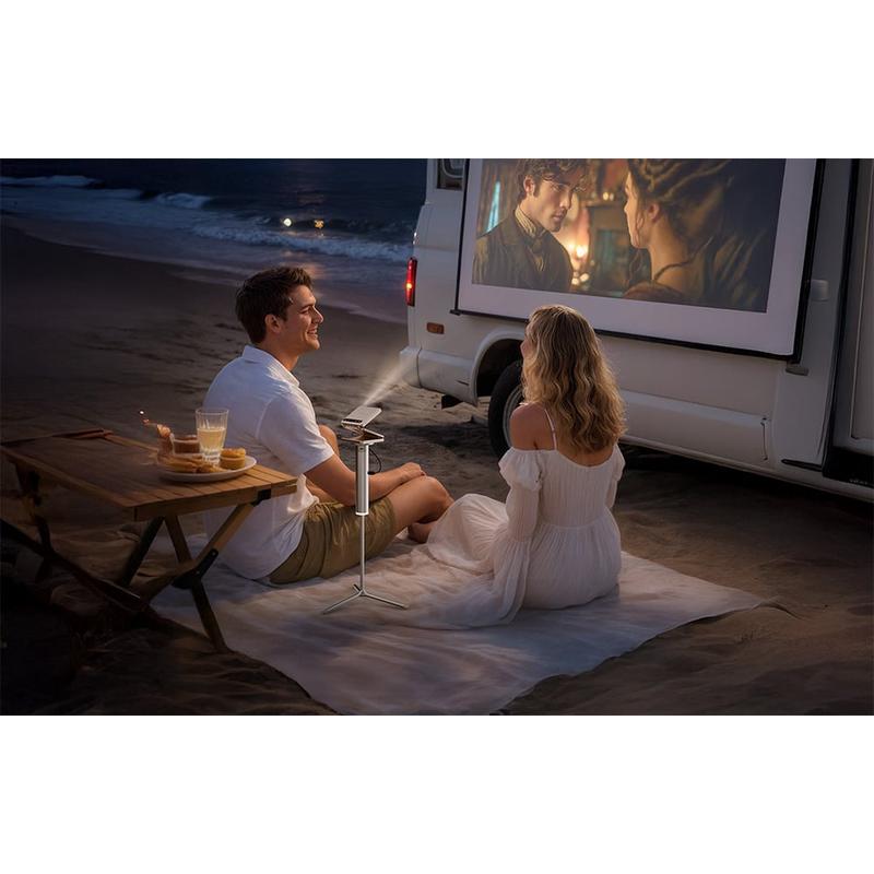 - Soirée cinéma en plein air : placez le support au sol, réglez la hauteur à 33 cm ou 43 cm et alimentez le projecteur à partir de la batterie intégrée