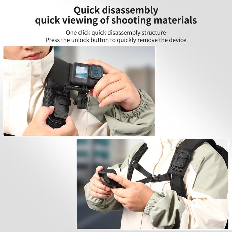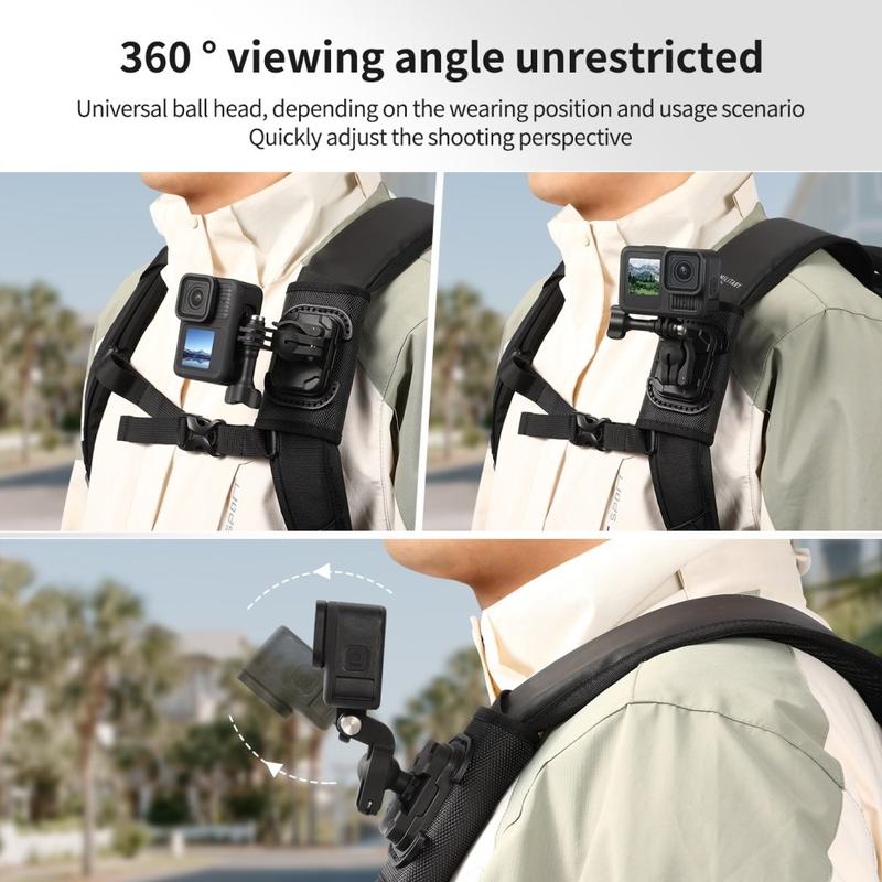 Le support est également équipé d'une rotule universelle permettant un réglage flexible de l'angle, ce qui facilite le positionnement de votre caméra pour des prises de vue en POV ou en angle latéral, selon la façon dont vous portez votre sac à dos. Grâce à sa conception légère, sa construction en nylon et fibre résistante et sa fonction de dégagement rapide, c'est un accessoire pratique pour les créateurs et les amateurs de plein air qui souhaitent filmer plus facilement en déplacement.