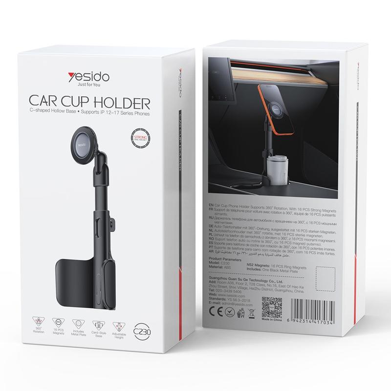 Gardez votre téléphone en sécurité et bien en vue pendant que vous conduisez grâce au support de téléphone pour porte-gobelet Yesido C230. Doté d'une base creuse innovante en forme de C, ce support vous permet de placer votre téléphone dans le porte-gobelet tout en laissant de la place pour une boisson, optimisant ainsi le confort sans compromettre la fonctionnalité.