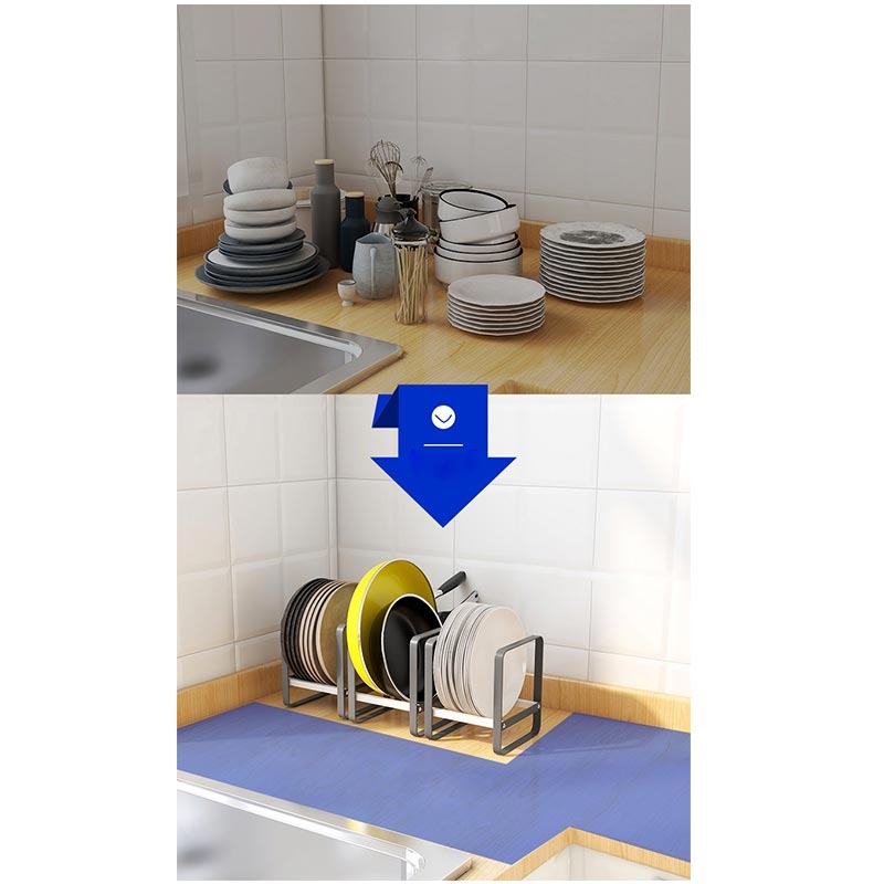 La disposition compacte mais fonctionnelle maximise l'espace du comptoir tout en gardant les assiettes, les bols et les couvercles bien rangés.