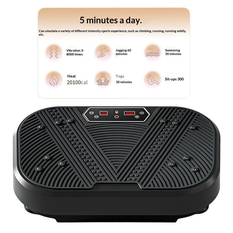 Personnalisez chaque séance grâce à 120 niveaux d'intensité réglables et 10 programmes prédéfinis. Contrôlez facilement les paramètres à l'aide de la télécommande sans fil ou du panneau de commande intégré afin d'adapter l'appareil à vos objectifs de remise en forme, de l'activation légère à l'entraînement intensif par vibrations.