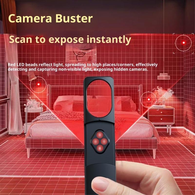 Le scanner infrarouge à LED intégré révèle les lentilles des caméras cachées, même lorsqu'elles sont éteintes ou en mode secret. Il est idéal pour détecter les caméras à sténopé dans les miroirs, les détecteurs de fumée, les bouches d'aération, les horloges et autres objets.