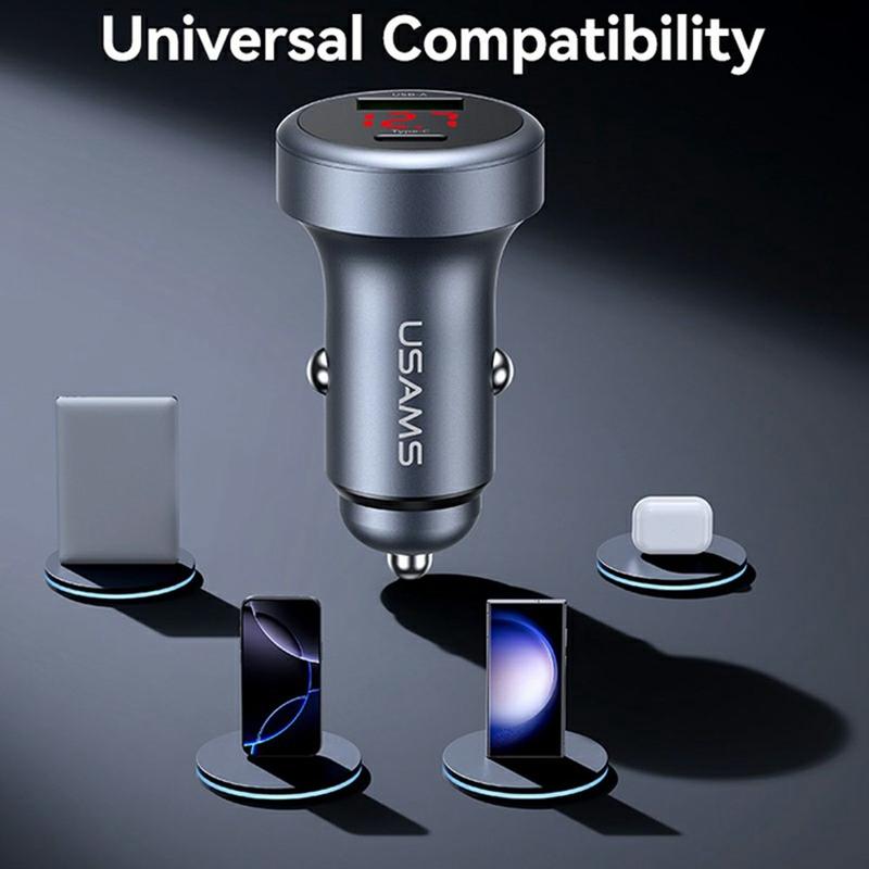 • Usams CC327 C44 Chargeur de voiture à double port - Adaptateur en aluminium à charge rapide 45W avec affichage de la tension