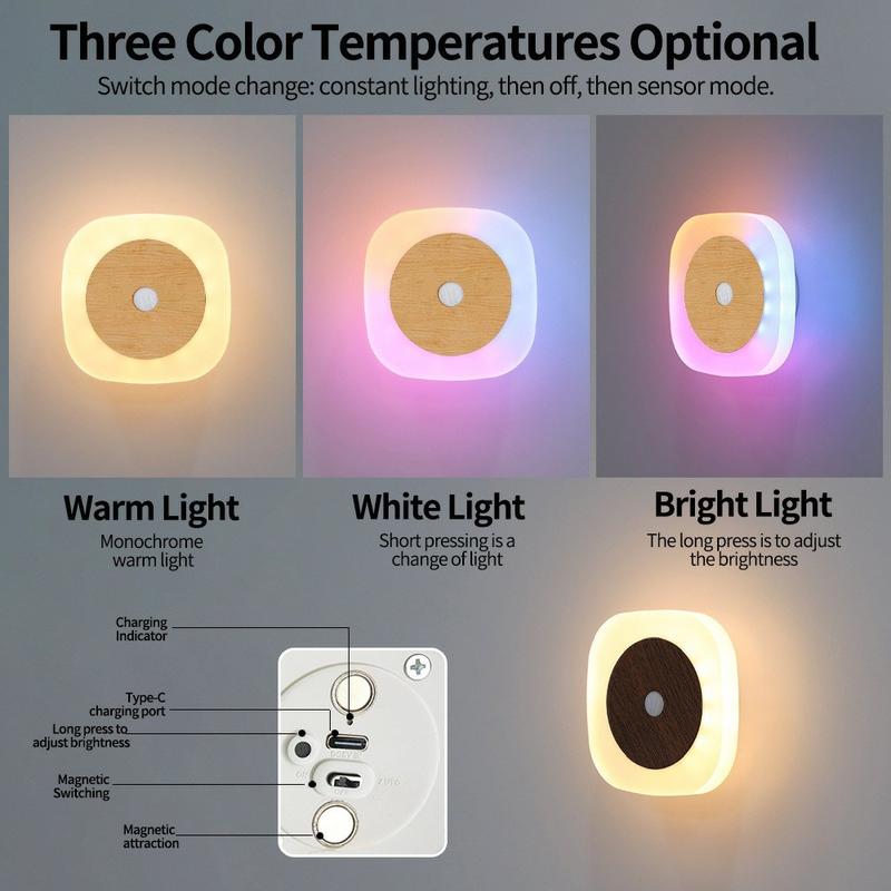 Veilleuse LED carrée à détecteur de mouvement - Lampe murale magnétique rechargeable avec 3 températures de couleur et éclairage d'ambiance orientable à 360°