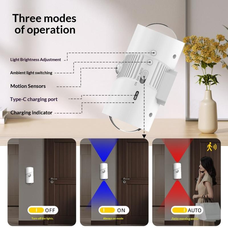 Son système de détection intelligent réagit aux mouvements dans des conditions de faible luminosité, s'allumant automatiquement et s'éteignant après un court délai pour économiser l'énergie. Avec 4 niveaux de luminosité et plusieurs modes d'éclairage, elle peut être utilisée à la fois comme veilleuse pratique et comme éclairage d'ambiance chaleureux. Son système d'installation magnétique facilite son placement, sans perçage ni configuration compliquée.